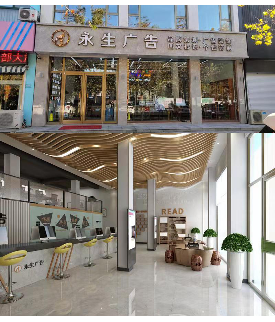 公司自有數(shù)碼沖床設備、500W光纖機、高精度大幅面噴繪機、寫真機、UV機、多種大小型雕刻機、吸塑機、全自動圍字機、自動開槽機、激光焊接機、拋光機等生產(chǎn)加工設備,擁有完善的設計團隊、技術團隊、施工團隊、售后團隊,可為廣大客戶提供室內(nèi)裝修、店招門頭、精神堡壘、黨建標識、標識標牌、宣傳欄、LED顯示屏、警示標識、精品字、證卡胸牌、證書獎杯、燈箱、桌牌、定制禮品、展具、噴印等多種專業(yè)廣告服務...